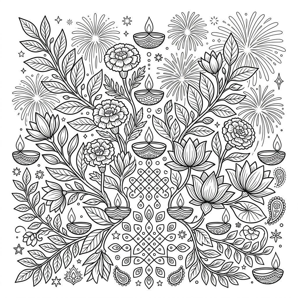 Dive into the festive spirit of Diwali with this intricate botanical art coloring page, beautifully combining traditional motifs with natural elegance. It's a perfect way to celebrate the festival of lights with a creative and relaxing activity.