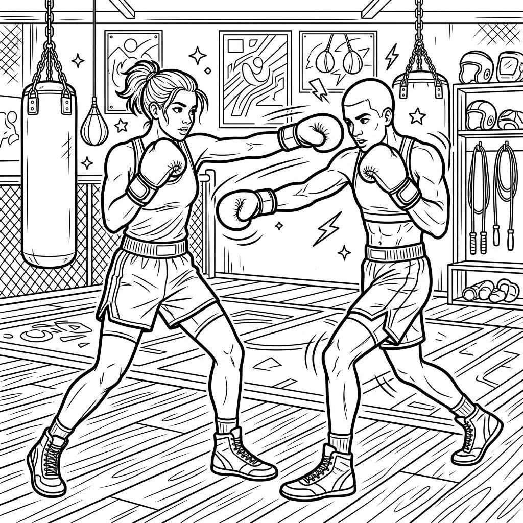 This captivating coloring template plunges you into the heart of a bustling boxing gym, where two determined boxers, a male and a female, are caught mid-action in an intense shadowboxing session. Every detail, from their focused expressions and athletic gear to the backdrop of heavy bags, speed bags, and shelves laden with gloves and headgear, brings the scene to life. The dynamic poses suggest movement and power, inviting colorists to capture the raw energy of their training.