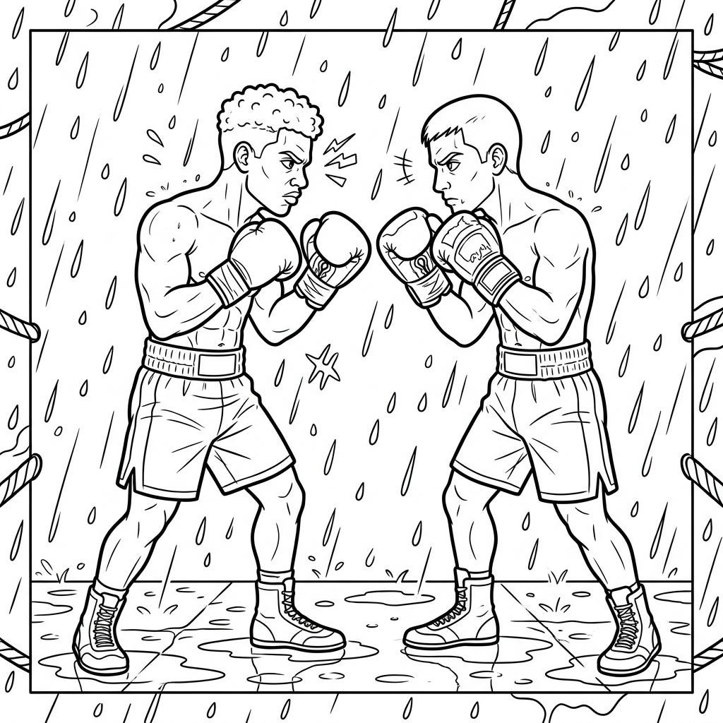 This captivating coloring page plunges you into the heart of a boxing match's most intense moment: the staredown. Two formidable boxers stand opposite each other, muscles tensed and eyes locked, each vying for psychological dominance before the first bell. The scene is made even more dramatic by the elements, as heavy raindrops streak across the page, creating an atmospheric veil around the combatants and shimmering puddles reflecting the tension on the ground.