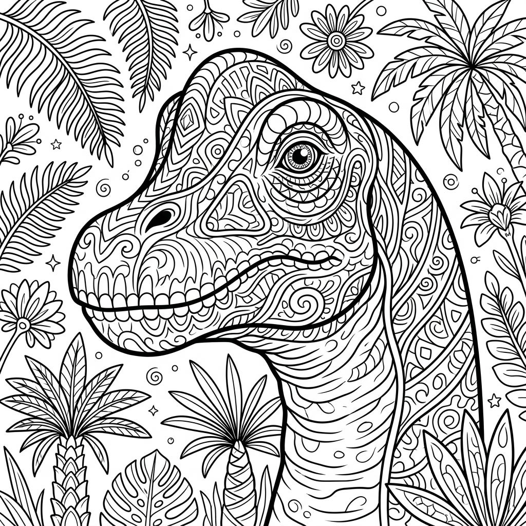 Journey back to the age of dinosaurs with this stunning Brachiosaurus head coloring page, adorned with captivating, complex patterns. Designed for adult enthusiasts, it offers a relaxing escape amidst lush prehistoric flora.