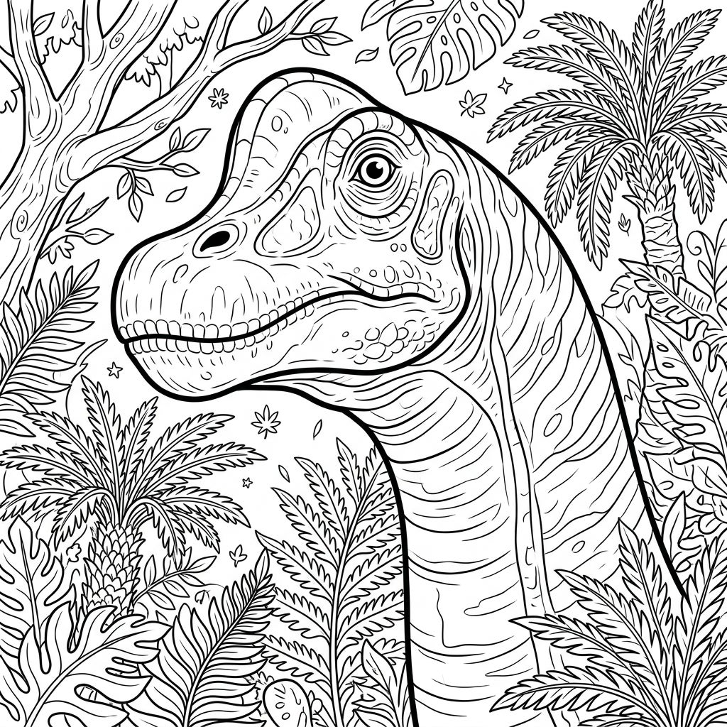Dive into a prehistoric adventure with this intricately detailed Brachiosaurus head coloring page, specially designed for teens. Explore its distinctive features amidst lush jungle foliage, perfect for an engaging coloring session.