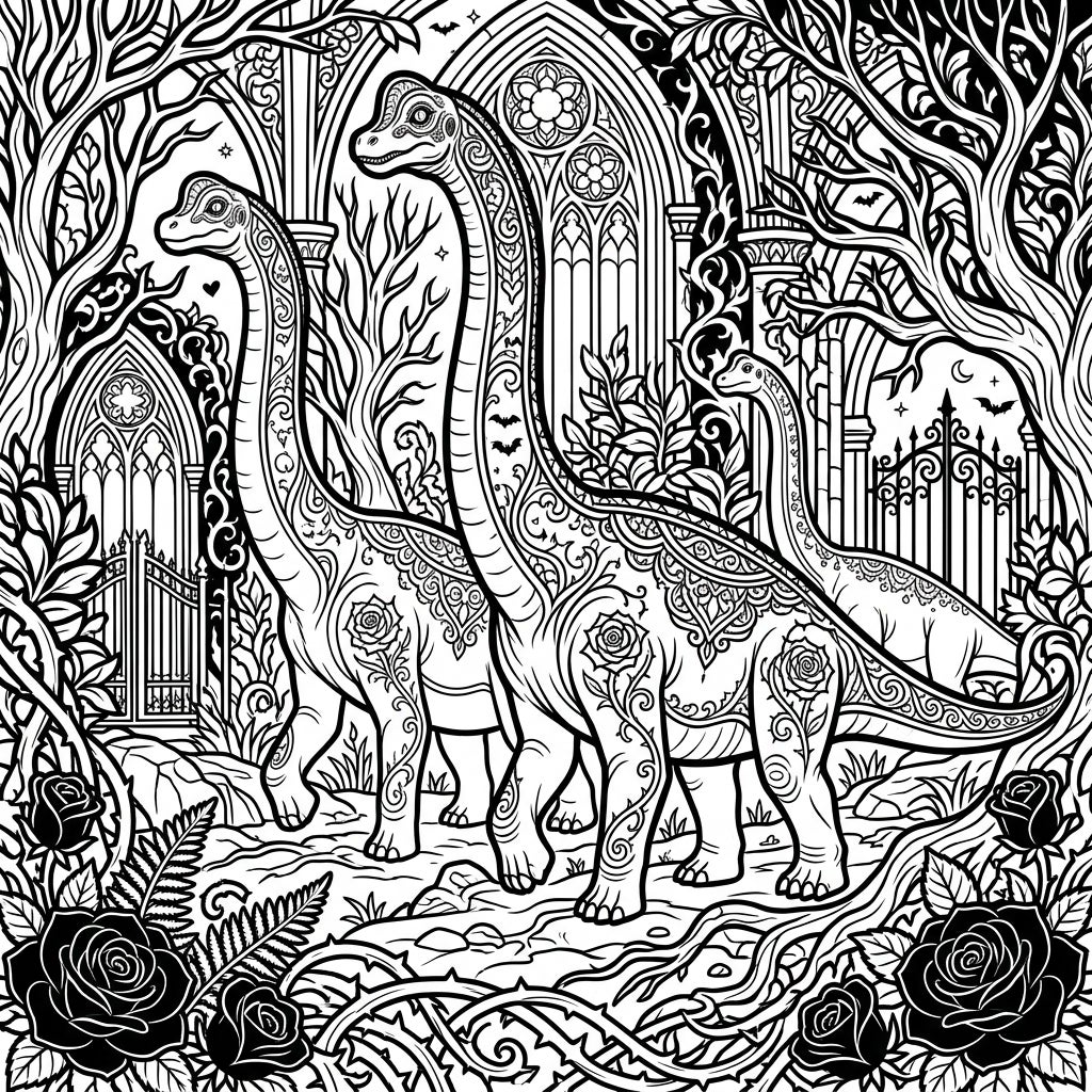 Step into a darkly enchanting realm with our 'Gothic Brachiosaurus Herd' coloring template, a masterful blend of prehistoric grandeur and intricate dark fantasy. This unique design showcases three magnificent Brachiosaurus, each adorned with elegant, swirling patterns reminiscent of delicate Victorian lace and blooming roses. They stand amidst a lush, yet somber, landscape featuring twisted, bare trees, thorny vines, and dramatic gothic architecture like ornate arched gateways and windows, creating a truly immersive and detailed scene.