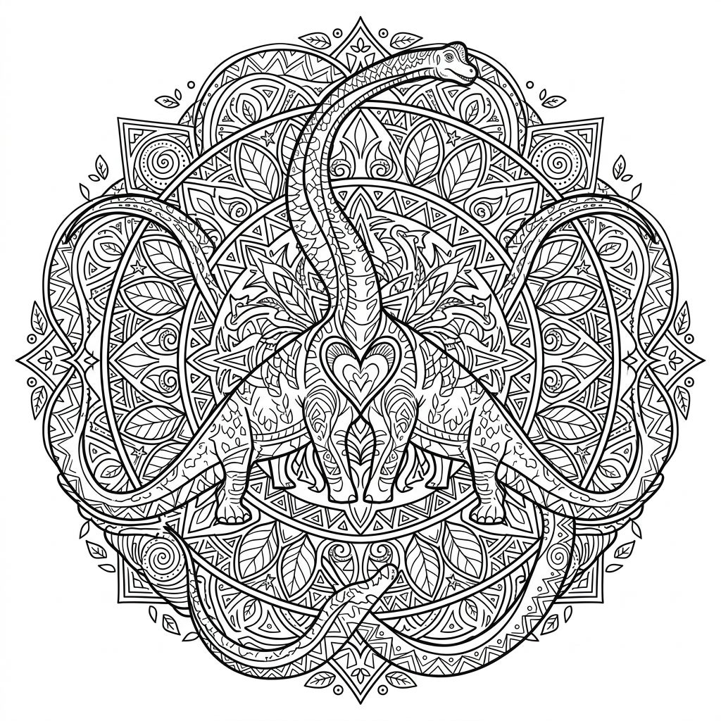 Journey back to the age of dinosaurs with our captivating Brachiosaurus Mandala coloring page. This extraordinary design intricately weaves the majestic, long-necked Brachiosaurus into a stunning radial mandala, creating a harmonious blend of prehistoric power and serene symmetry. Observe how the dinosaur's graceful form is adorned with elaborate patterns, including delicate leaves, swirling vines, and precise geometric motifs, all radiating from a central point, making every inch a discovery.