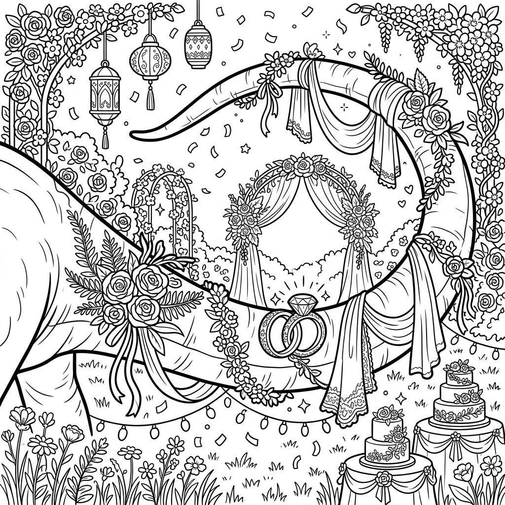 Unleash your creativity with this intricately designed coloring page, showcasing a majestic Brachiosaurus tail beautifully transformed for a wedding celebration. Every detail invites your artistic touch, from the graceful curves of the tail itself to the opulent floral garlands and flowing drapery that embellish it. Look closely, and you'll discover charming elements like sparkling wedding rings with a prominent diamond, delicate hanging lanterns, and confetti scattering through the air, all set against a backdrop rich with botanical wonders.