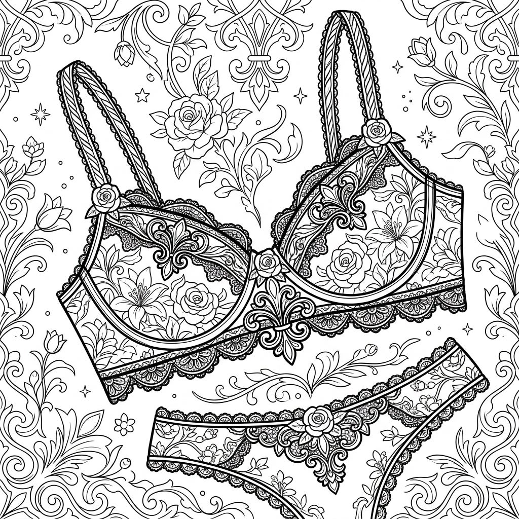Immerse yourself in the exquisite details of this coloring template, showcasing a beautifully designed bralette and matching underwear. Each piece is a canvas of intricate patterns, featuring delicate lacework, blooming roses, elegant lilies, and subtle spring flowers. Ornate gothic embellishments intertwine seamlessly with natural motifs, creating a visually rich and complex design that promises hours of engaging artistic expression.