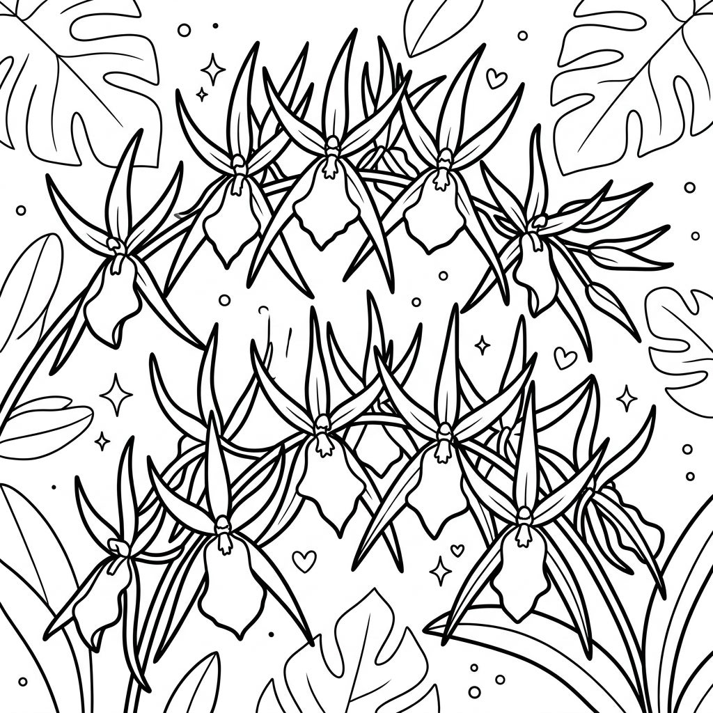 Dive into the enchanting world of 'Spider Orchids' with our Brassia Orchids coloring template, specifically crafted for little hands. This full-page illustration showcases multiple Brassia orchids with their iconic, spidery petals, rendered with bold, ultra-thick lines and expansive coloring areas. The background is thoughtfully adorned with simple, abstract tropical leaves and playful dots, creating a rich and engaging visual landscape for young artists.