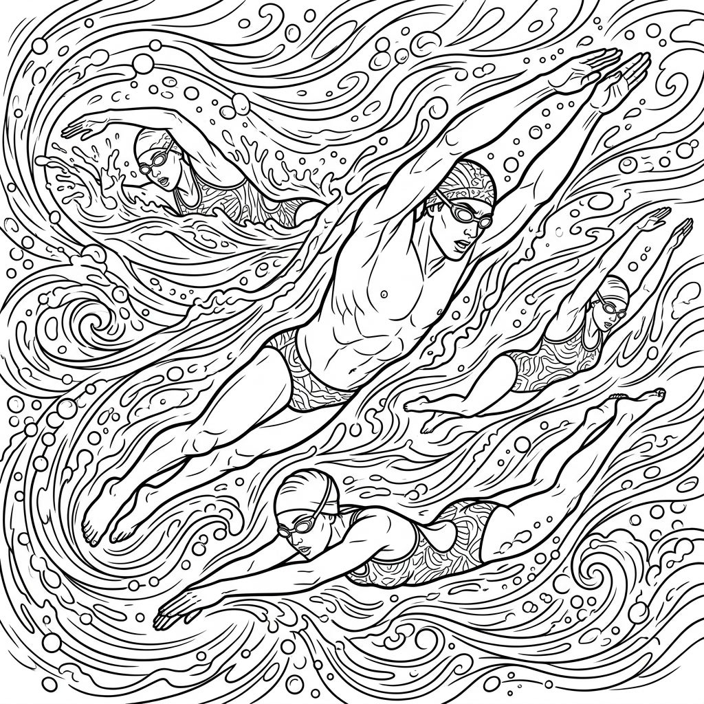 When coloring this aquatic masterpiece, consider a spectrum of blues and greens for the water, from deep ocean hues to bright turquoise, to highlight the depth and movement. Experiment with different shades for the swimmers' skin tones, goggles, and swimsuits to make each athlete unique. Don't forget to add shimmering effects to the bubbles and water splashes to enhance the feeling of motion and bring this exciting scene truly to life with your personal touch.