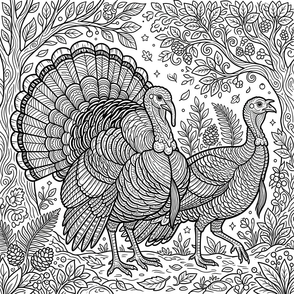 Prepare your favorite coloring tools – whether they're markers, colored pencils, or gel pens – and get ready to add your personal touch. Focus on the intricate feather patterns of the turkeys, using subtle shading to create depth and realism. For the forest, consider a vibrant autumn palette or lush greens to contrast with the turkeys' rich tones. Experiment with blending techniques on the leaves and berries to add texture, turning this detailed scene into your own unique masterpiece.