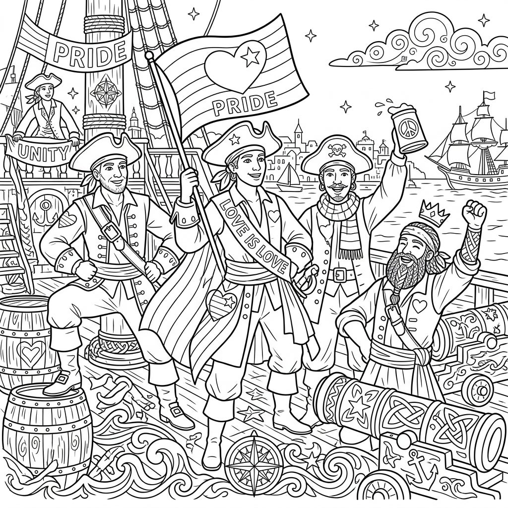 This coloring page captures the vibrant and inclusive spirit of Pride Month, reimagined through a thrilling pirate adventure. It’s a powerful celebration of love, diversity, and community, where every buccaneer stands together in unity. Imagine the colorful stories these privateers have to tell, as they navigate the seas, embracing their true selves and spreading a message of acceptance. This design is not just a picture; it’s an ode to freedom and the joy of being authentic, inviting you to join their merry crew.