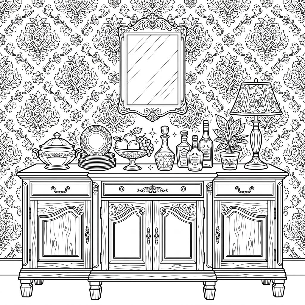This detailed coloring template is an excellent opportunity to experiment with various color palettes and shading techniques. Consider using warm tones for the wooden buffet to give it a rich, antique feel, or opt for brighter, contemporary hues to make a bold statement. Play with patterns on the wallpaper and fabrics, or add metallic accents to the mirror and decorative items. Dive in and transform this elegant scene into a masterpiece that truly reflects your unique style and vision!
