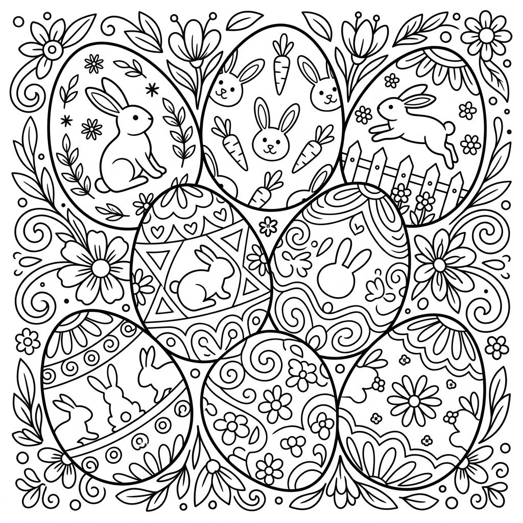 This intricate coloring page presents a beautiful collection of seven Easter eggs, each uniquely adorned with adorable bunny motifs and spring-themed patterns. From a charming bunny nestled among leaves and flowers to playful bunnies leaping over fences and cute bunny faces surrounded by carrots, each egg offers a distinct design. The eggs are gracefully framed by a lush border of blooming flowers, delicate leaves, and elegant swirling patterns, creating a rich and engaging tapestry of nature and festive cheer ready for your artistic touch.
