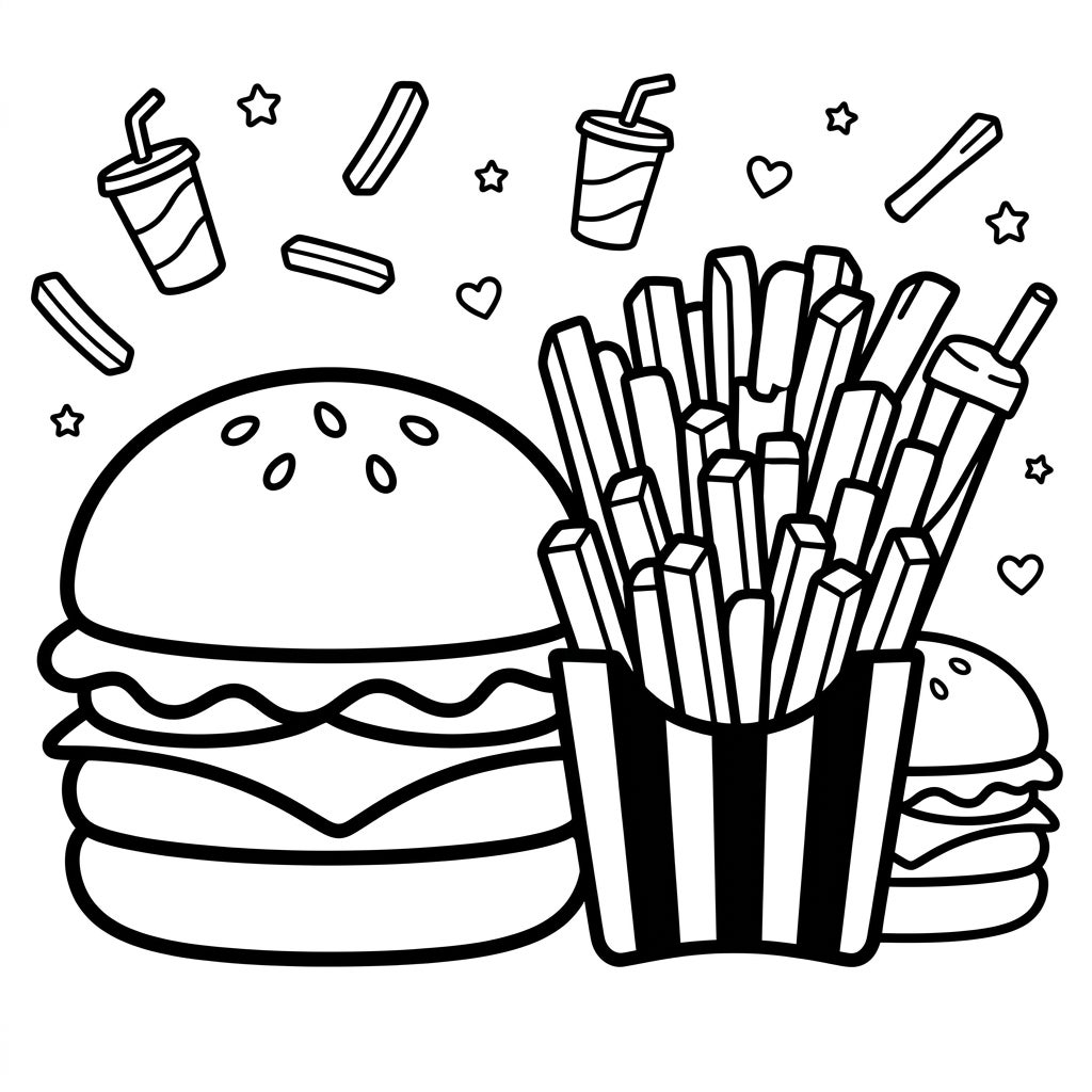 Get ready for a feast of colors with this delightful coloring page featuring classic fast-food favorites! This inviting illustration showcases a big, juicy hamburger complete with sesame seeds, a generous serving of crispy french fries in a striped container, and two refreshing drinks with straws. Behind the main spread, a smaller burger peeks out, adding to the mouth-watering scene. The background is playfully adorned with floating french fries, cute little stars, and hearts, making the entire composition vibrant and engaging.