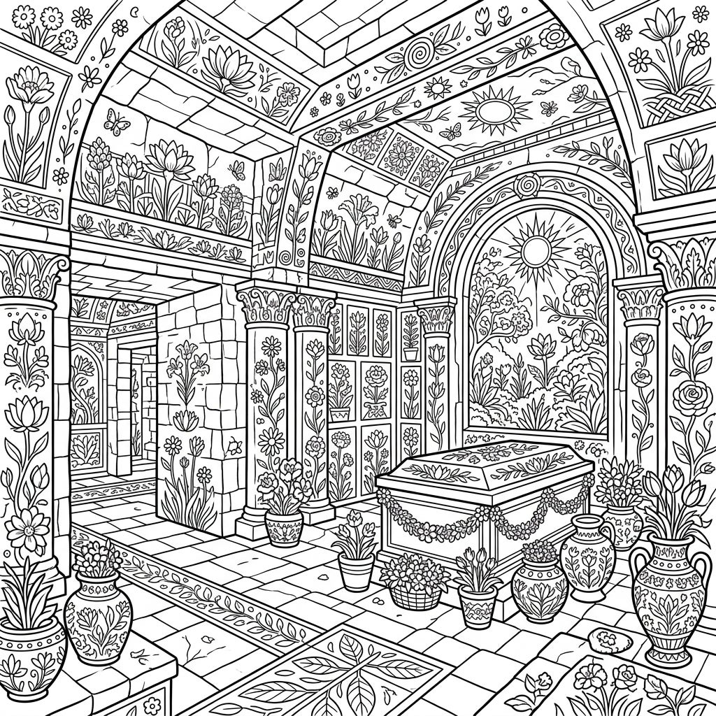 Unleash your creativity as you bring this extraordinary scene to life. Consider using a palette of bright spring greens, soft pinks, sunny yellows, and sky blues to highlight the floral patterns, making the chamber truly blossom. Don't shy away from earthy browns and grays for the stone architecture, perhaps adding touches of metallic gold or bronze to the sarcophagus and ornate vases for a regal touch. The intricate details provide ample opportunity for shading and blending, allowing you to create depth and texture that will make your finished masterpiece truly shine. Enjoy the therapeutic process of coloring each element, finding peace in every stroke.