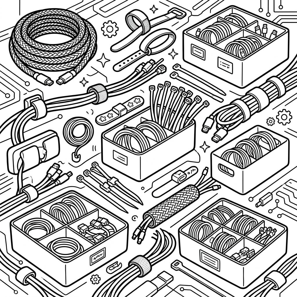 Bring order to the chaos with this engaging coloring page dedicated to cable management solutions. Explore a variety of sleeves, ties, and storage boxes, all ready for your creative touch.