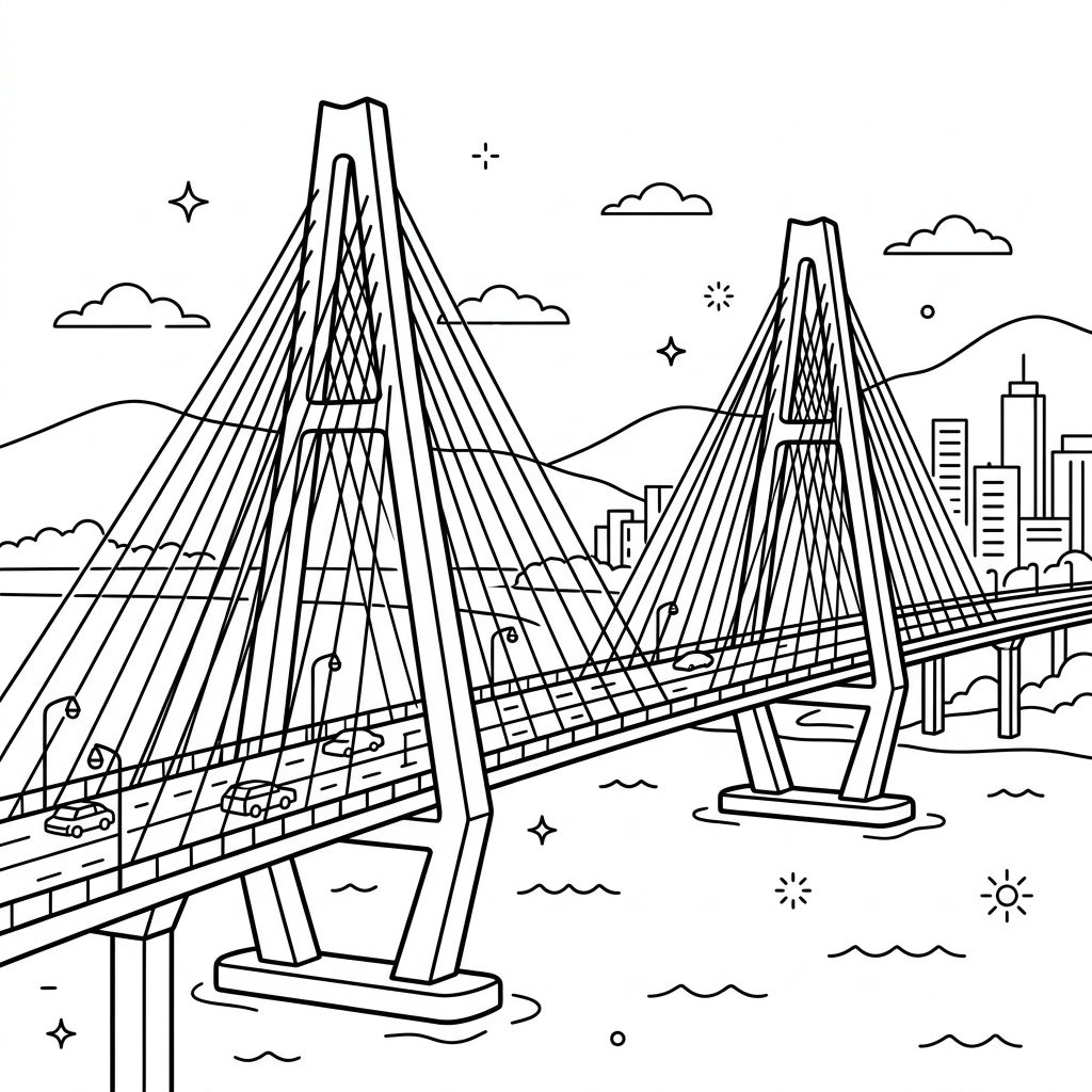 Embark on an exciting coloring journey with this detailed cable-stayed bridge scene! This captivating coloring page beautifully captures the grandeur of these modern engineering wonders, featuring two magnificent towers supporting a busy bridge deck with cars driving across. Below, the water gently ripples, reflecting the impressive structure above, while distant mountains and a bustling city skyline create a dynamic backdrop.