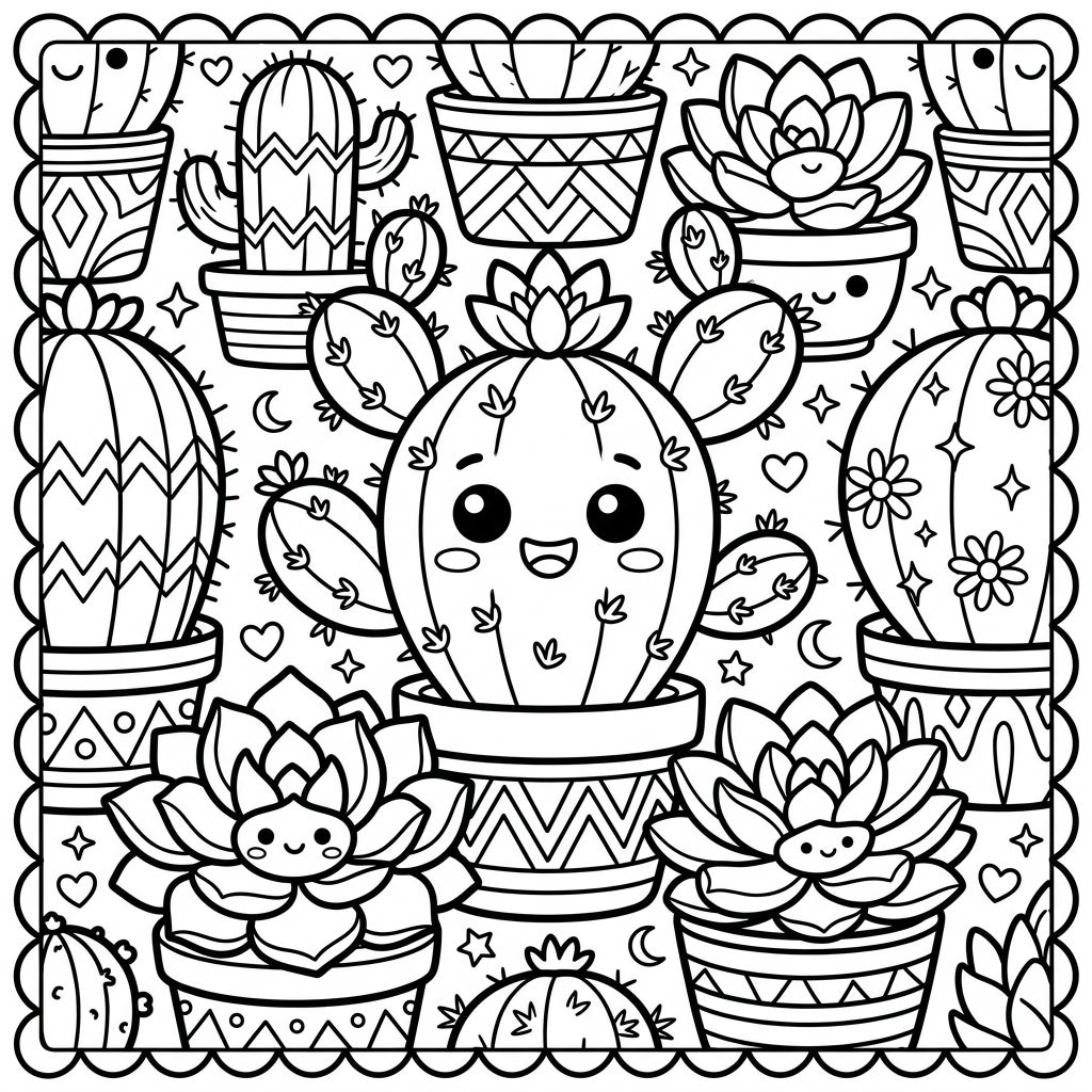 Step into a whimsical garden filled with an enchanting array of Kawaii cacti and succulents, all ready for your artistic touch. This delightful coloring page showcases a variety of potted plants, from spiky cacti to plump rosettes, each lovingly adorned with big, expressive eyes and cheerful smiles. Look closely, and you'll find intricate patterns on their pots and subtle background elements like tiny hearts, stars, and crescent moons, adding an extra layer of charm to this already adorable scene.