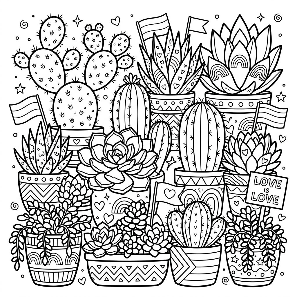Immerse yourself in a vibrant garden where nature meets celebration with our Cacti & Succulents Pride coloring page. This intricate design features a delightful array of potted desert plants, including various spiky cacti and leafy succulents, all nestled together. Discover charming details like miniature Pride flags poking out from the foliage, artistic rainbow patterns gracing the pots, and delicate hearts and stars sprinkled throughout, creating a truly festive and welcoming scene. The prominent 'LOVE IS LOVE' sign stands as a beautiful centerpiece, reinforcing the page's message of acceptance and unity for all.