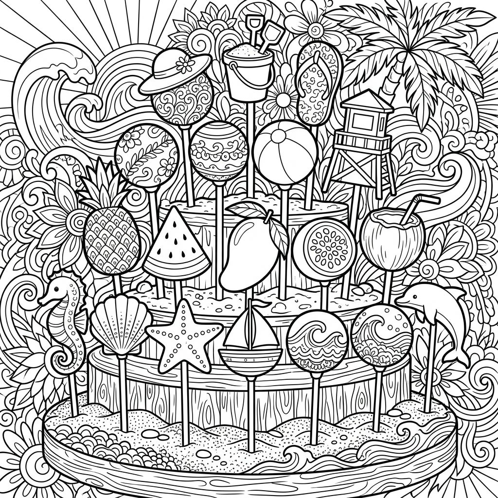 Immerse yourself in a wonderfully detailed summer celebration captured in this intricate adult coloring page. The central focus is a multi-tiered display, artfully arranged with an abundance of cake pops, each a miniature masterpiece. Discover cake pops shaped and adorned with classic summer symbols like a juicy pineapple, a refreshing watermelon slice, a ripe mango, and a cool coconut drink. Other delightful designs feature a charming seahorse, a playful dolphin, a delicate seashell, a sturdy starfish, and a tiny sailboat, alongside more abstract patterns of swirling waves. Look closer to find even more whimsical details, such as a cake pop topped with a tiny sun hat, a sand bucket and shovel, a beach ball, flip-flops, and even a miniature lifeguard tower, all meticulously rendered to spark your imagination.