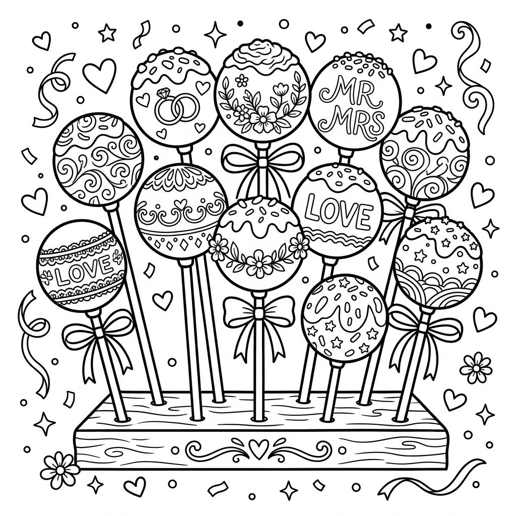 Dive into the sweet world of wedding celebrations with this charming cake pop coloring page. Each treat is beautifully adorned with romantic details, offering a delightful and intricate coloring experience.
