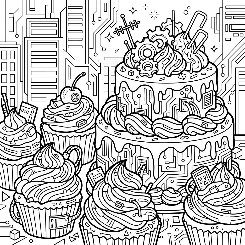 Prepare for a taste of the future with this extraordinary Cyberpunk Cakes & Cupcakes coloring page! This intricate design presents a magnificent multi-tiered cake and five delectable individual cupcakes, each transformed into a marvel of futuristic engineering. Observe the detailed circuit board patterns adorning the frosting, the delicate wires connecting elements, and the robust gears crowning the main cake, all set against a backdrop of a high-tech urban cityscape etched with circuit lines. Every swirl of frosting and every cupcake wrapper invites you to explore a world where sweet treats meet advanced technology.