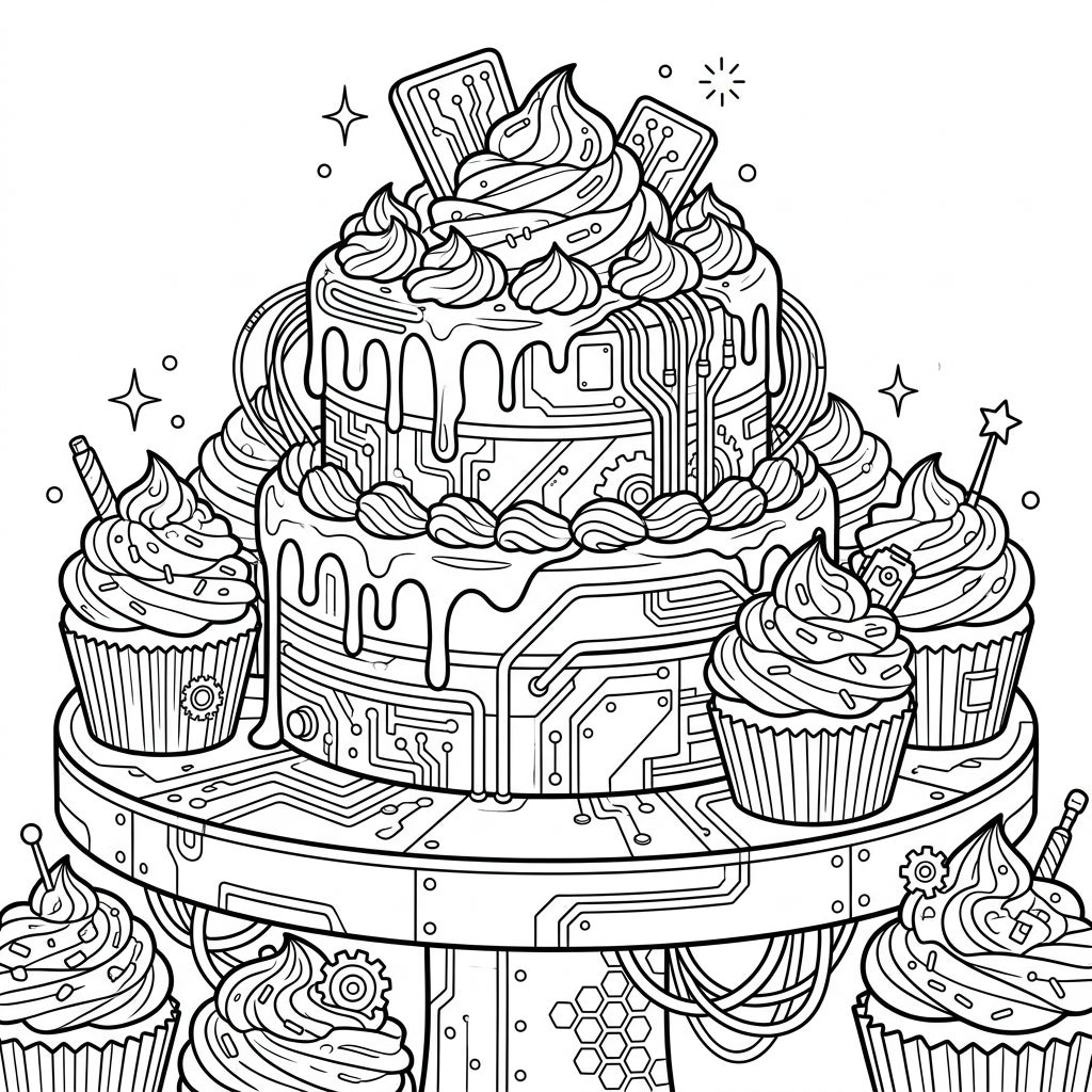 What truly sets this scene apart is the ingenious fusion of confectionery with high-tech details. Every surface of the cake and cupcakes is intricately etched with circuit board patterns, exposed wires, and subtle gears, transforming these sweet treats into futuristic masterpieces. This imaginative blend invites you to explore a world where celebrations are powered by microchips and indulgence has an advanced edge, offering a unique narrative to color.