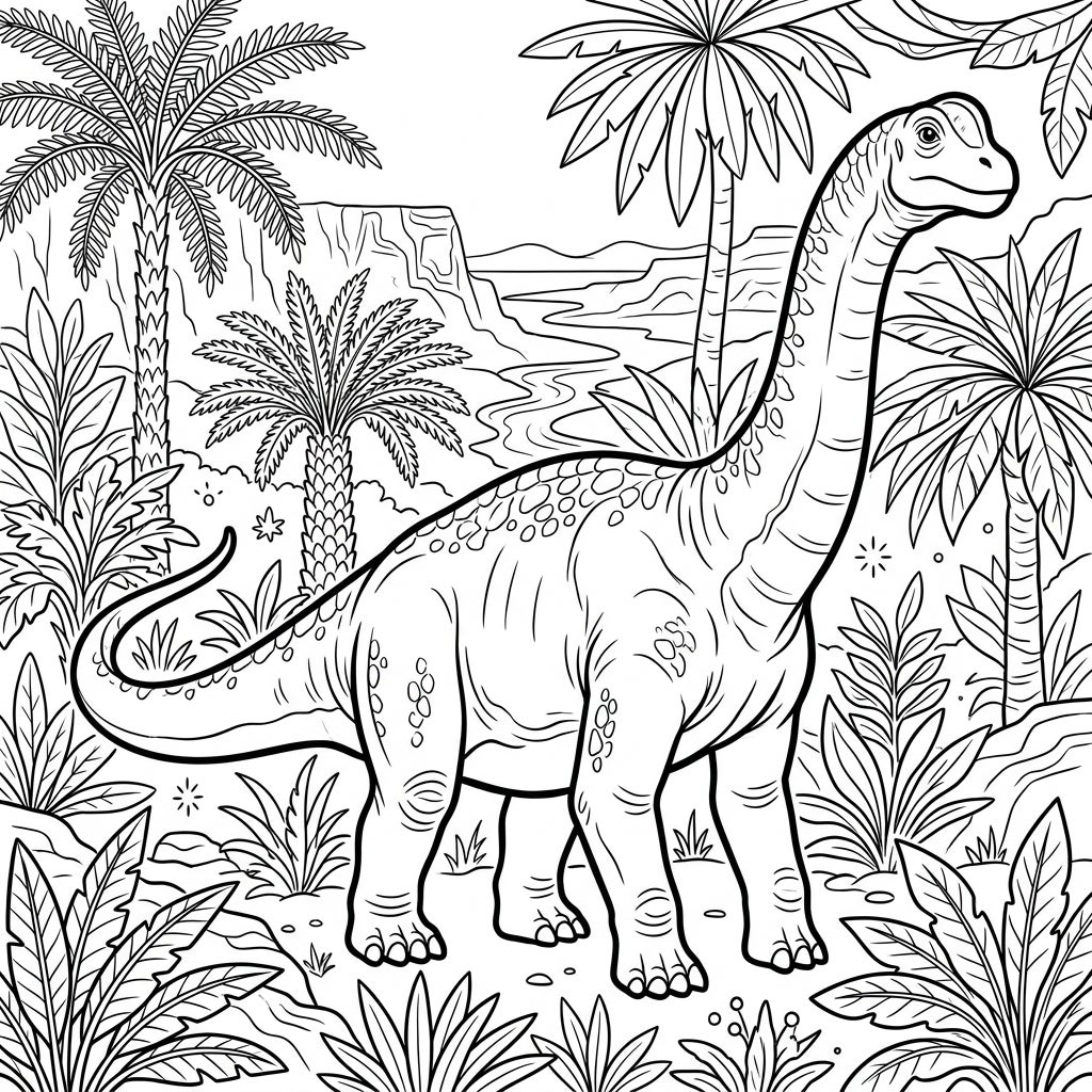 Unleash your artistic flair on this incredible Camarasaurus coloring template, meticulously designed for an immersive prehistoric experience. This majestic sauropod, known for its distinctive short, deep skull, stands grandly at the center, its detailed skin patterns awaiting your creative touch. Surrounding the gentle giant is a rich tapestry of ancient flora, including various leafy plants and towering palm trees that evoke a dense primeval forest.