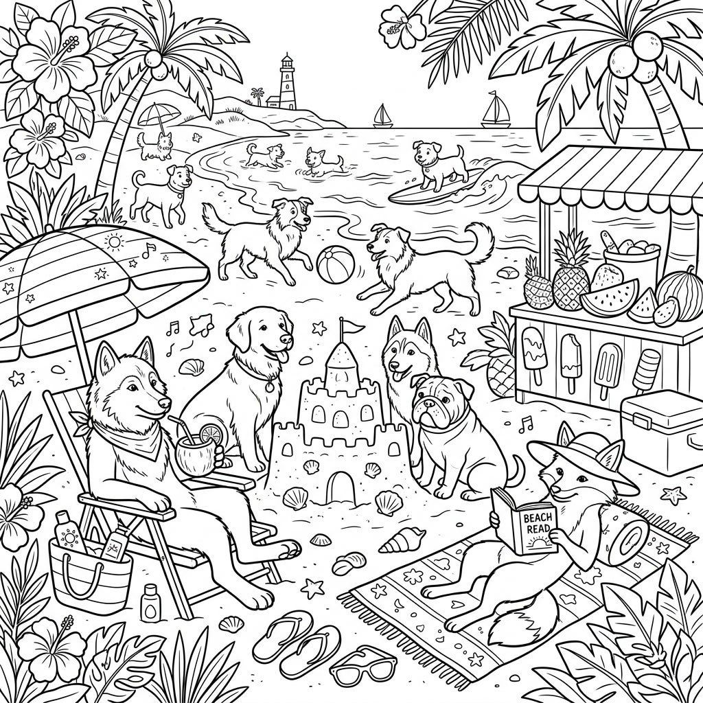 Embrace the joyous spirit of a perfect summer vacation, tailor-made for relaxation and imaginative expression, especially for seniors. This coloring template perfectly captures the essence of a sun-drenched day, where the warmth of the sun and the refreshing ocean breeze create a serene yet lively atmosphere. The diverse group of canines, from playful puppies to relaxed adults, evokes feelings of companionship, happiness, and stress-free enjoyment. It's more than just a picture; it's an invitation to reminisce about cherished summer memories or dream of new seaside adventures, providing a wonderful opportunity for cognitive stimulation and a sense of calm.