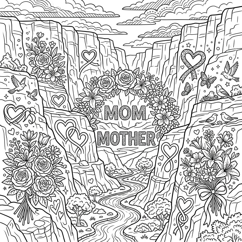 Show Mom your love with this breathtaking Mother's Day coloring page featuring majestic canyon walls. Adorned with beautiful floral arrangements, loving hearts, and natural elements, it's a perfect tribute to her.