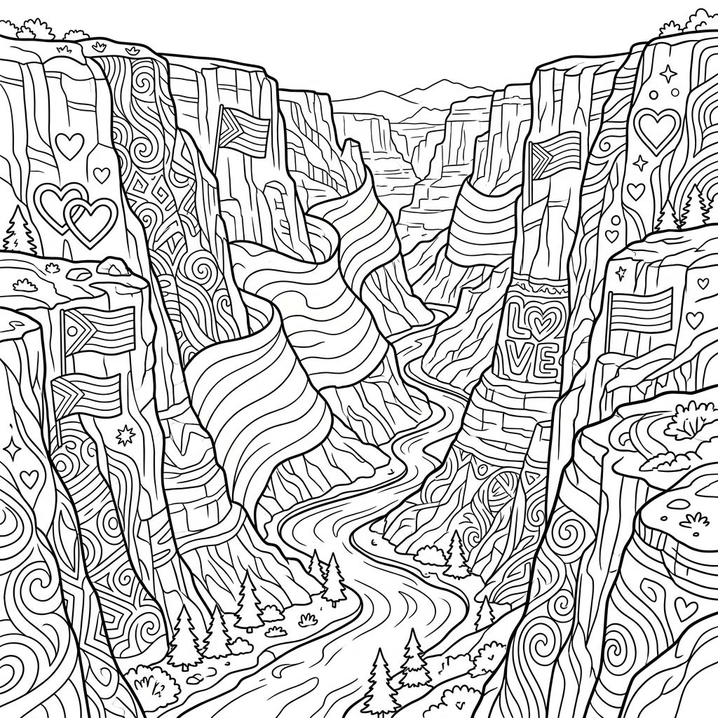 Unleash your creativity as you decide on the palette for these magnificent canyon walls. Consider using traditional rainbow colors for the flags and symbols, perhaps contrasting them with warm, earthy tones for the rocks and cool blues for the river. Experiment with shading and blending to give the canyon depth and texture, making every heart, star, and pattern stand out. This page offers endless possibilities to create a personalized masterpiece that truly resonates with your artistic vision.