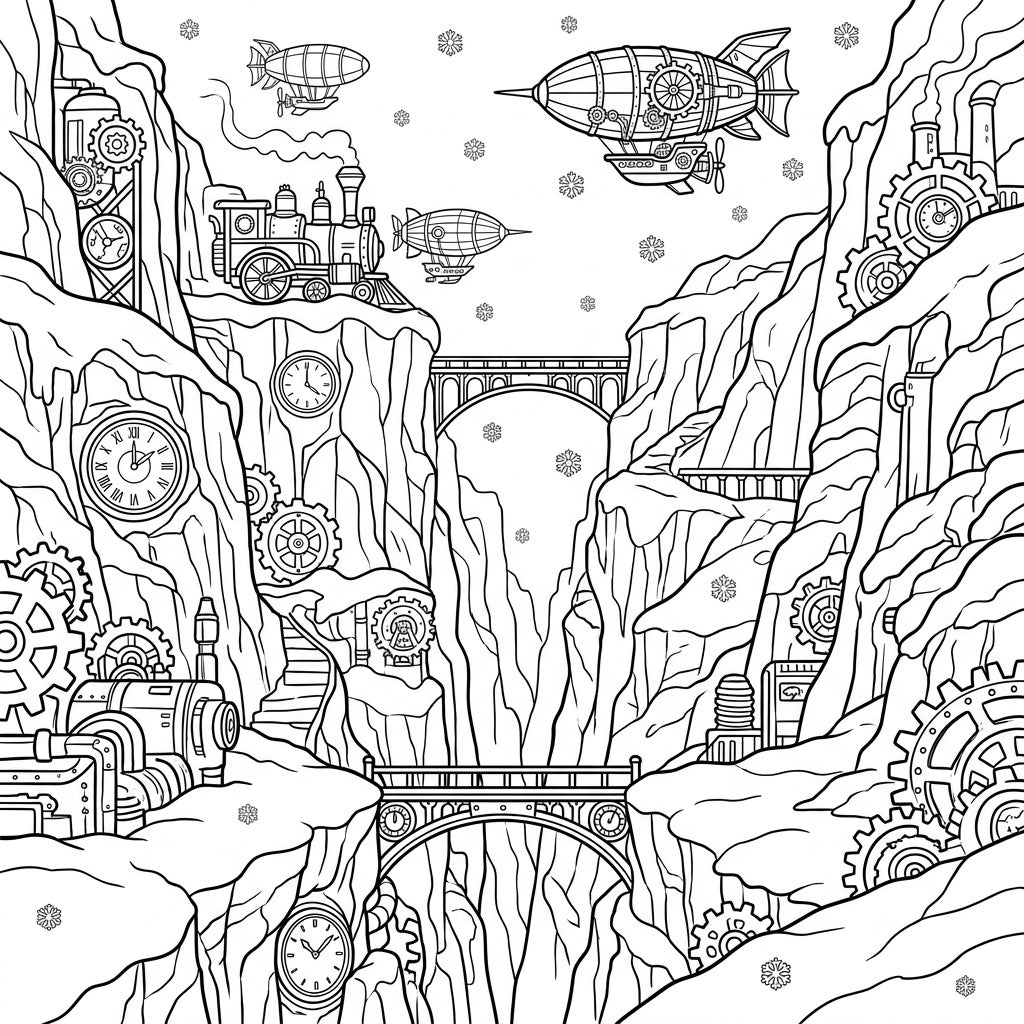 Dive into a breathtaking illustration that merges the grandeur of natural canyons with the intricate marvels of steampunk engineering. This detailed coloring page presents deep, winding gorges, their steep walls blanketed in pristine snow and ice. Embedded within these rocky formations, discover a fascinating array of steampunk machinery: massive gears, vintage clocks with Roman numerals, complex pipe systems, and various retro-futuristic gadgets that seemingly power this wondrous landscape. A sturdy bridge spans the canyon below, while another connects distant cliffs, creating an impressive feat of construction.