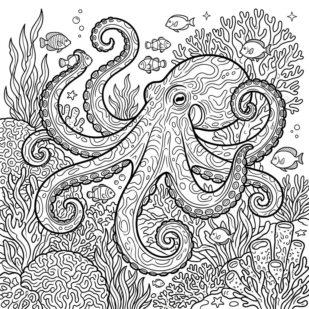 Unleash your creativity as you bring this underwater world to life! Consider using a spectrum of blues and greens for the water and plants, while exploring vibrant hues for the coral reefs – from fiery reds to sunny yellows. For the Caribbean Reef Octopus, think about its natural ability to change color; perhaps you can use different shades and textures to mimic its remarkable camouflage, or go wild with fantastical colors. Don't forget to add shimmering details to the fish and bubbles to complete your masterpiece. Grab your favorite coloring tools and let your imagination swim free!