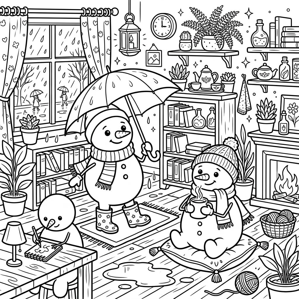 Brighten up a gloomy day with this delightful coloring page featuring whimsical cartoon snowmen enjoying a cozy indoor rainy day scene. From umbrellas to warm drinks, there's plenty of charm to color and cherish.