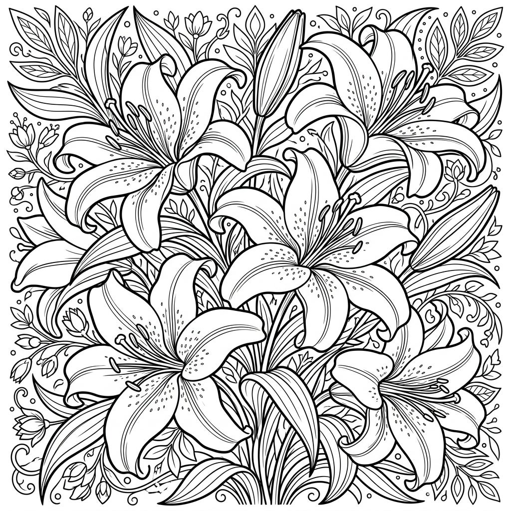 Uncover the sophisticated charm of our Casablanca Lilies coloring page, a true delight for budding artists aged 9-17. This exquisite design showcases a lush arrangement of magnificent Casablanca lilies, celebrated for their grand blooms and graceful form. Each flower is rendered with fine line work, capturing the subtle textures of their petals and the emerging beauty of unopened buds, all set within a rich tapestry of botanical elements.