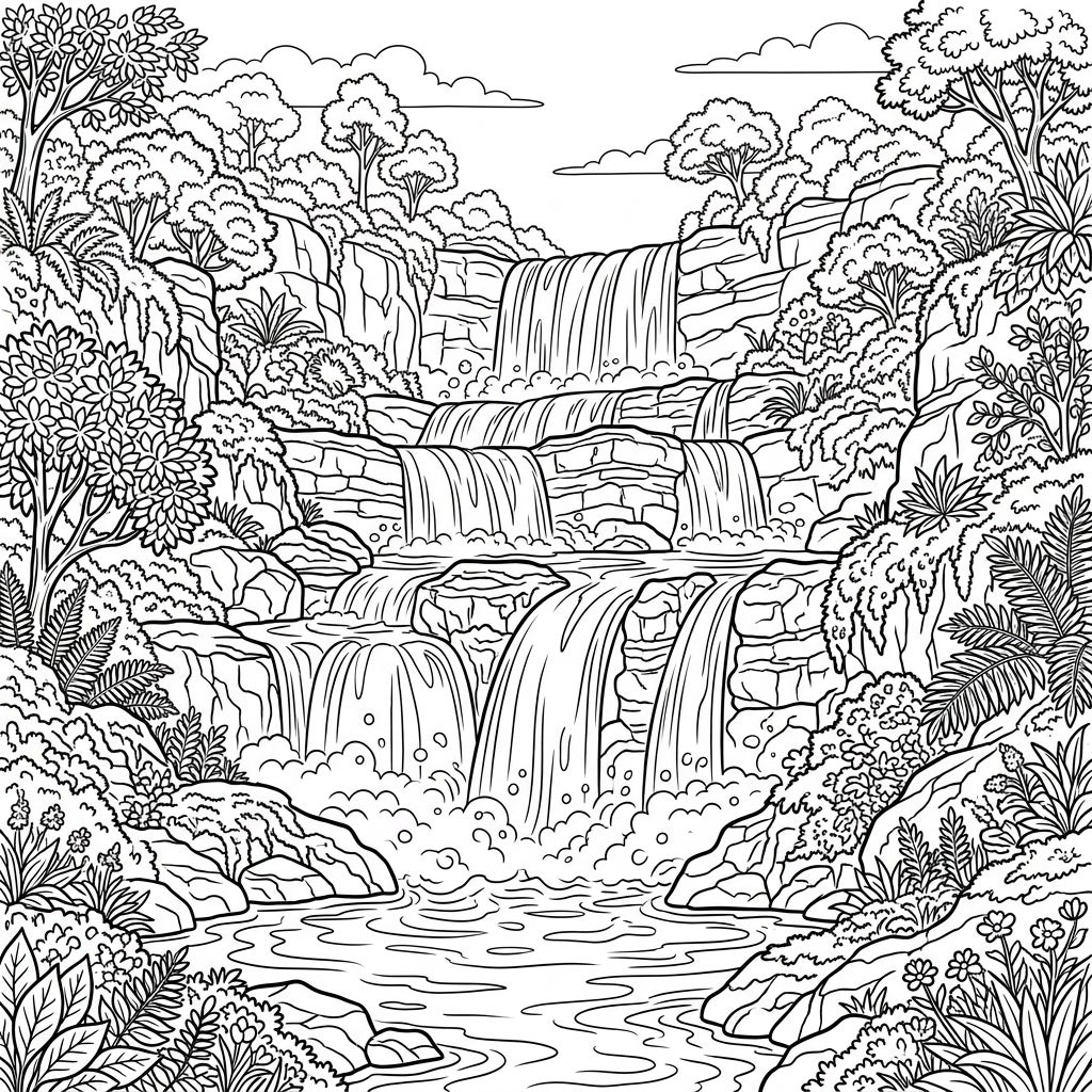 Step into a breathtaking natural sanctuary with this detailed coloring page featuring majestic cascade waterfalls. Observe the intricate design where water gracefully descends over a series of rugged rock steps, each tier contributing to the dynamic flow. The scene is richly framed by an abundance of natural elements, including varied lush foliage, delicate ferns, and moss-covered rocks, all meticulously outlined to offer a captivating canvas for your artistic expression.