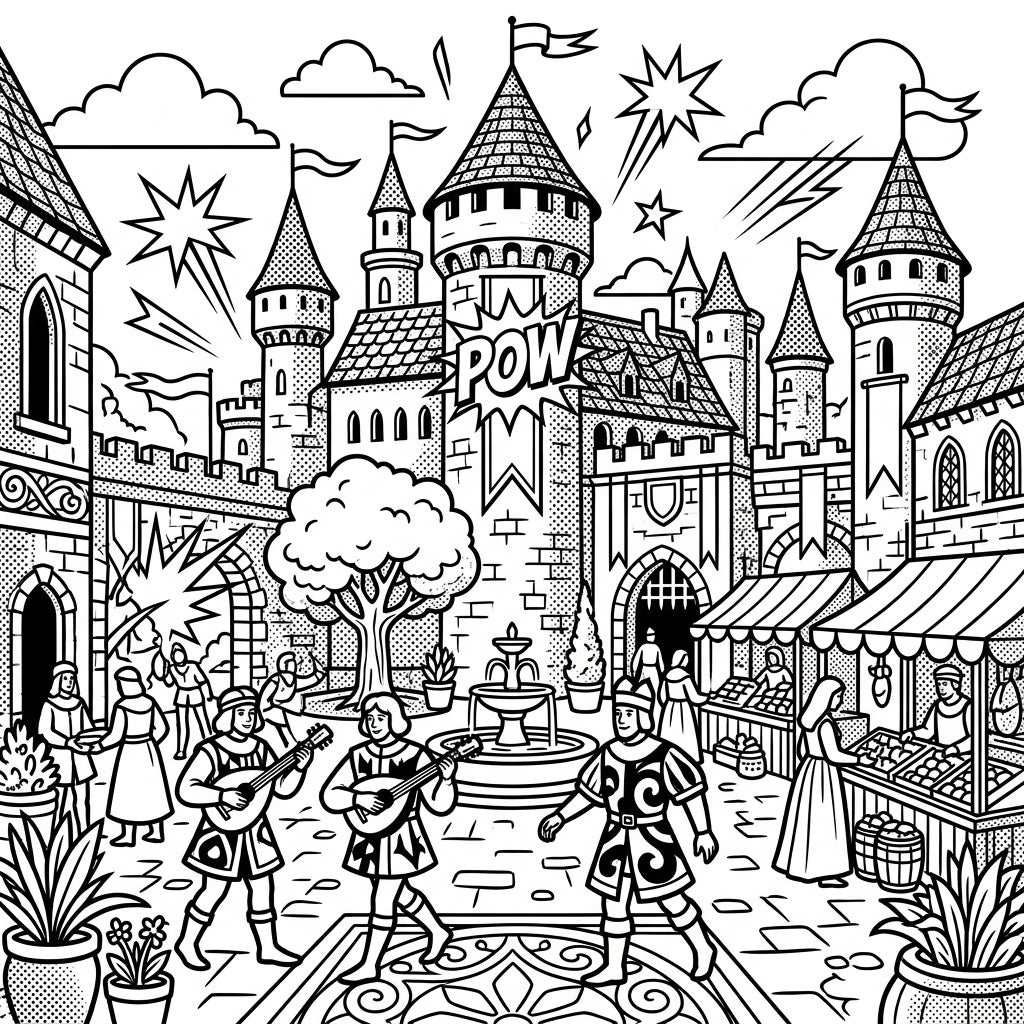 Step into a dynamic world where medieval charm meets vibrant Pop Art! This unique coloring page offers a bustling castle courtyard scene, complete with musicians, market stalls, and iconic comic book flair, all waiting for your creative touch.