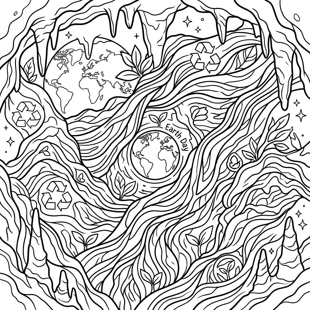 Journey into the heart of nature with this captivating coloring page, blending the mesmerizing forms of cave draperies with vital Earth Day themes. Discover hidden globes, recycling symbols, and lush foliage, all waiting for your creative touch.