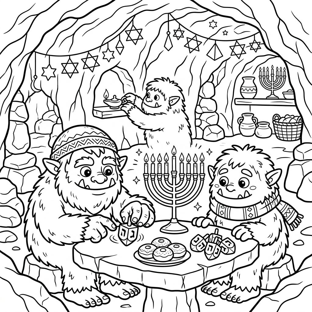 Experience a truly unique Hanukkah celebration with our adorable cave trolls! This coloring page combines festive Jewish traditions with the charm of subterranean creatures for a delightful artistic adventure.