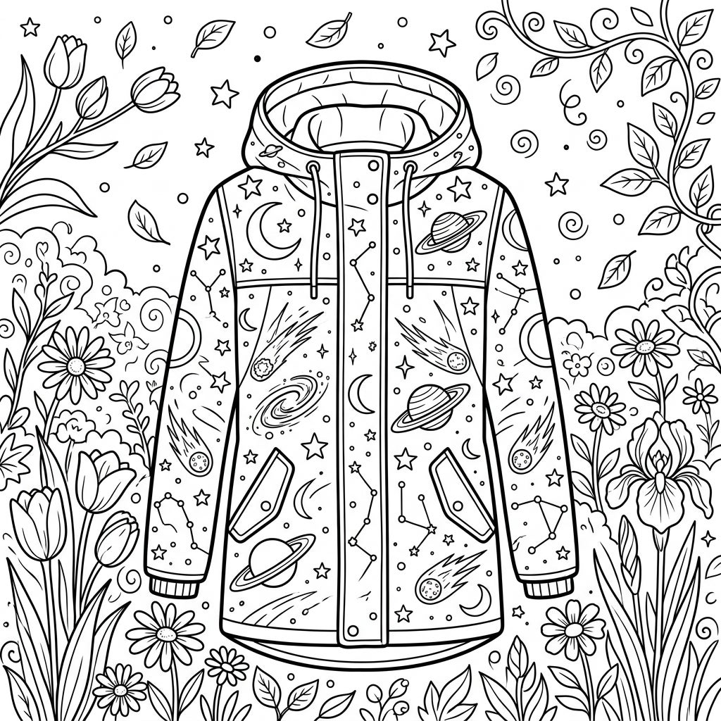 Unveil the magic of the cosmos blended with the beauty of spring in this intricate coloring page. At its heart lies a stylish piece of outerwear, meticulously detailed with glittering stars, crescent moons, swirling galaxies, and distant planets. The jacket is a canvas of astronomical wonder, inviting you to bring its cosmic patterns to life with your chosen palette.