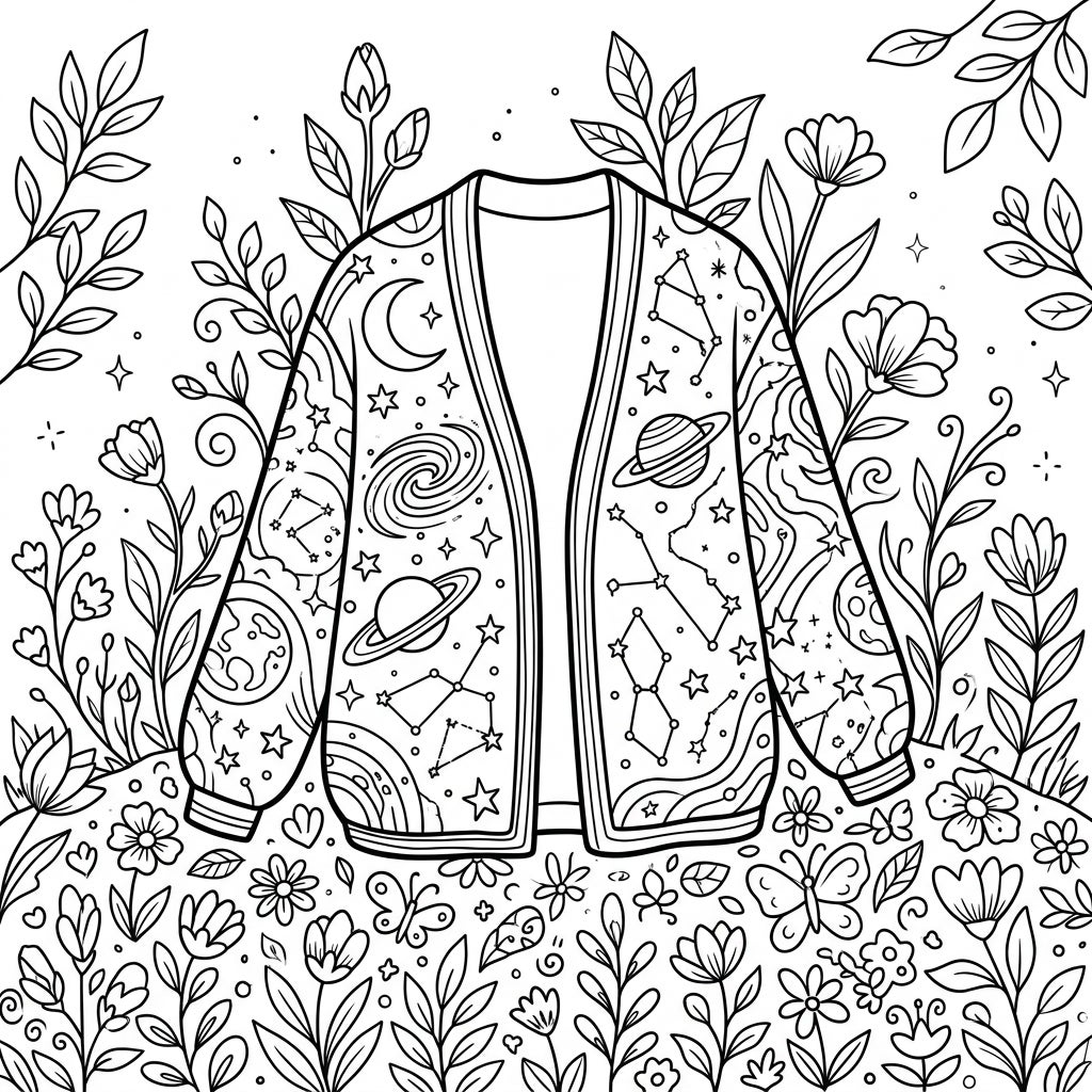 Drift into a world where celestial wonders meet the fresh embrace of spring with this unique coloring page. Featuring a beautifully patterned cardigan adorned with cosmic elements, nestled among blooming flowers and new growth.