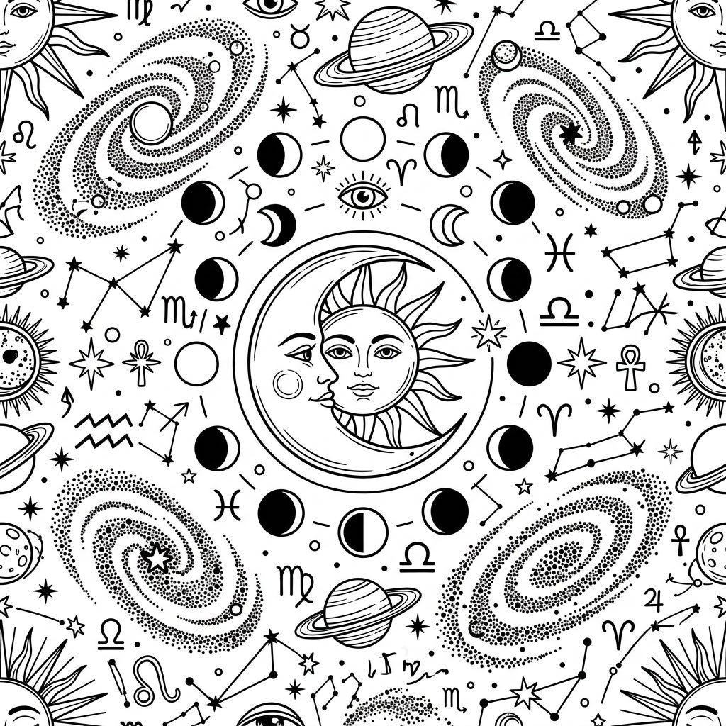 Perfectly tailored for teenagers, this design speaks to a generation fascinated by the mysteries of the cosmos, personal horoscopes, and the vastness beyond our world. It's an ideal creative outlet for those who love trendy aesthetics and more complex compositions, offering a chance to explore themes of destiny, spirituality, and the interconnectedness of the universe. This isn't just a coloring page; it's an invitation to ponder the stars and find a moment of mindful escape.