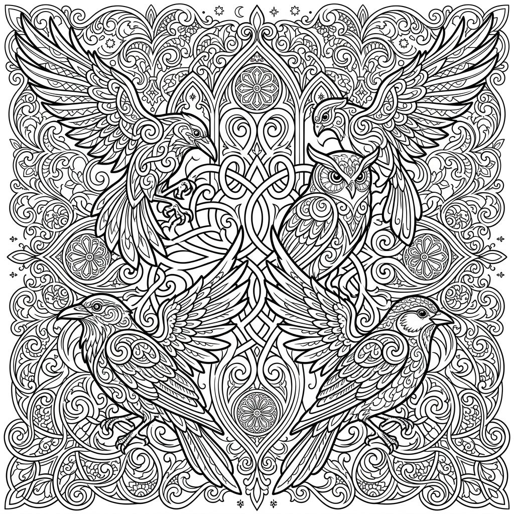 Unleash your creativity as you bring this intricate masterpiece to life. Consider a rich palette of deep jewel tones, muted earthy shades, or even a striking monochrome scheme to enhance its Gothic allure. The detailed patterns offer countless opportunities for shading and blending, making it an ideal choice for experienced colorists seeking a rewarding challenge. Enjoy the meditative process of coloring and watch as these symbolic birds and ancient knots reveal their hidden depths under your artistic hand.