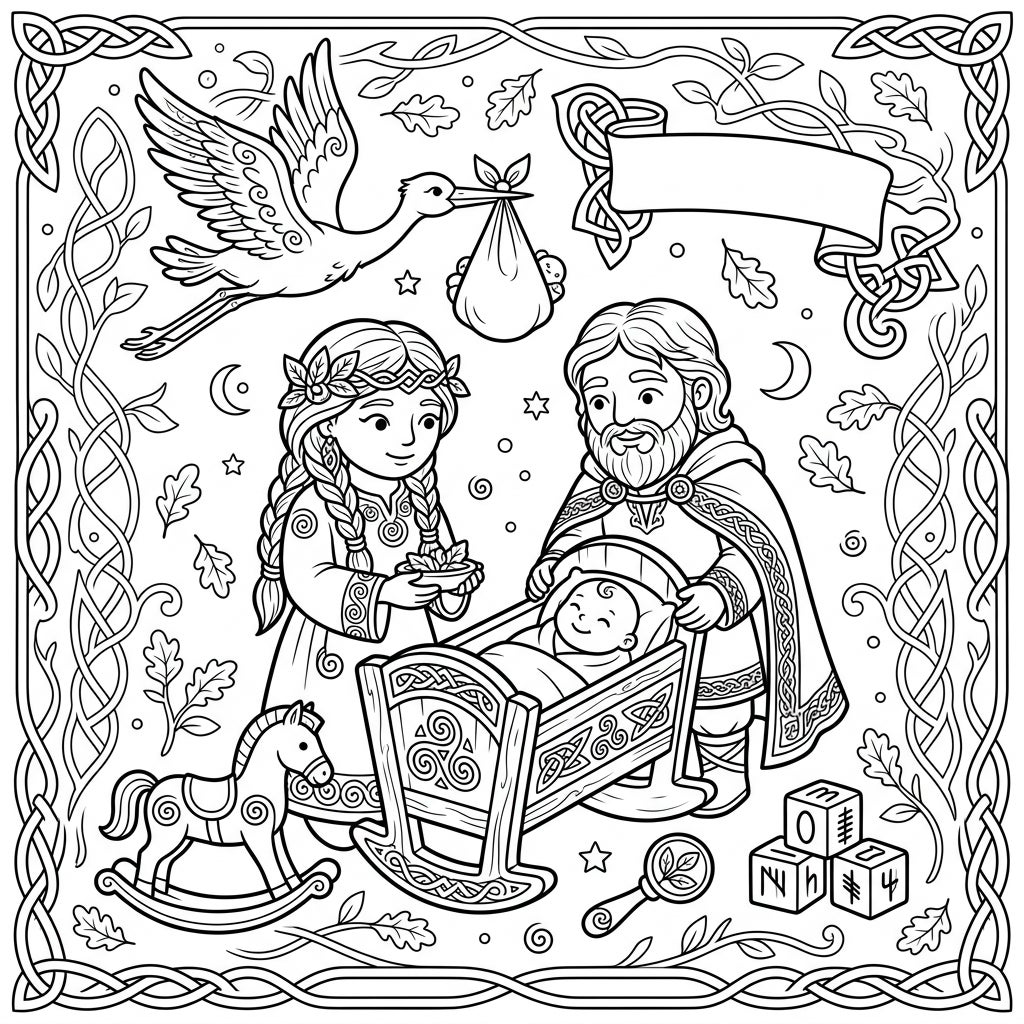 Immerse yourself in a beautifully detailed coloring page depicting a heartwarming Celtic Deities Baby Shower. In the center, a loving Celtic god and goddess stand proudly beside an intricately carved wooden cradle, cradling a serene newborn. Above them, a majestic stork soars, delivering its precious bundle, while charming nursery items like a rocking horse, symbolic baby blocks, and a delicate rattle complete the festive scene. The entire illustration is framed by an exquisite border of interwoven Celtic knots and lush oak leaves, inviting you to explore every enchanting detail.
