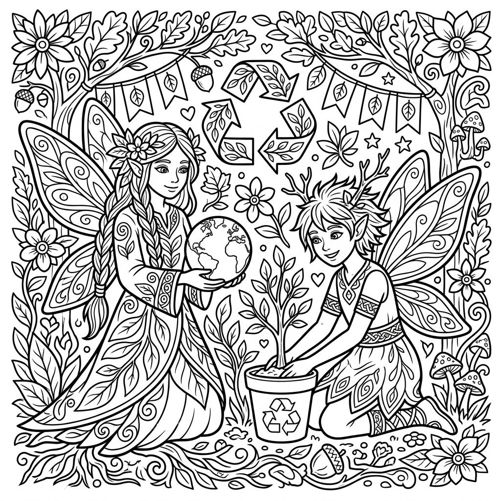 Discover a whimsical scene where two graceful Celtic fairies are deeply connected to nature's well-being. One enchanting female fairy cradles the Earth gently in her hands, symbolizing global protection, while a spirited male fairy diligently plants a sapling in a pot adorned with a recycling symbol. The entire composition is framed by a rich tapestry of lush foliage, including intricate leaves, blooming flowers, tiny acorns, and whimsical mushrooms, all inviting your creative touch to bring this magical world to life.