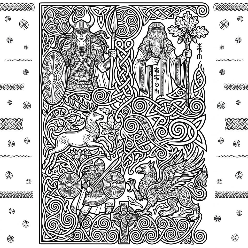 Step into the rich tapestry of ancient Celtic mythology with this highly detailed bookmark coloring page. This intricate design features a compelling assembly of legendary figures, including a valiant female warrior adorned with a horned helmet and spear, a wise druid clutching a staff crowned with oak leaves, and a fierce male warrior ready for battle. Amidst these powerful human figures, a graceful stag leaps through foliage, while a majestic griffin, a symbol of strength and vigilance, stands guard.