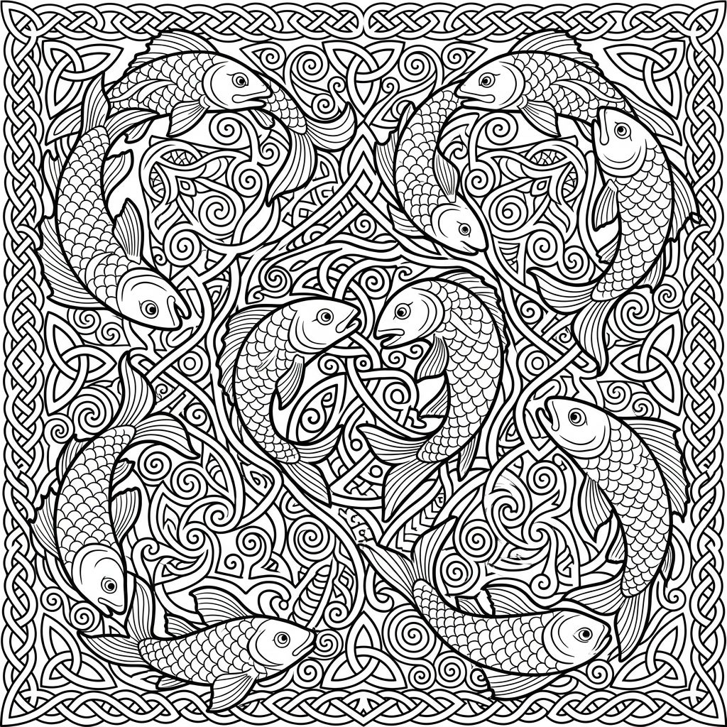 Unravel the beauty of ancient artistry with this intricate Celtic Fish Knots coloring page. Immerse yourself in a world of flowing lines and symbolic fish, perfect for a calming and creative escape.