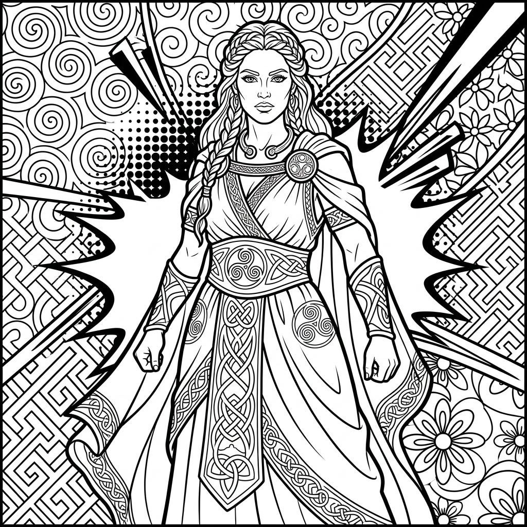 The unique fusion of revered Celtic tradition with the bold, graphic energy of Pop Art makes this template truly stand out. The background explodes with dynamic patterns—halftone dots, comic-book style bursts, swirling spirals, and geometric Celtic knots—creating an exciting contrast to the goddess's timeless presence. This design invites colorists to explore a narrative where ancient power meets contemporary cool, sparking inspiration with every stroke of your pencil or marker.