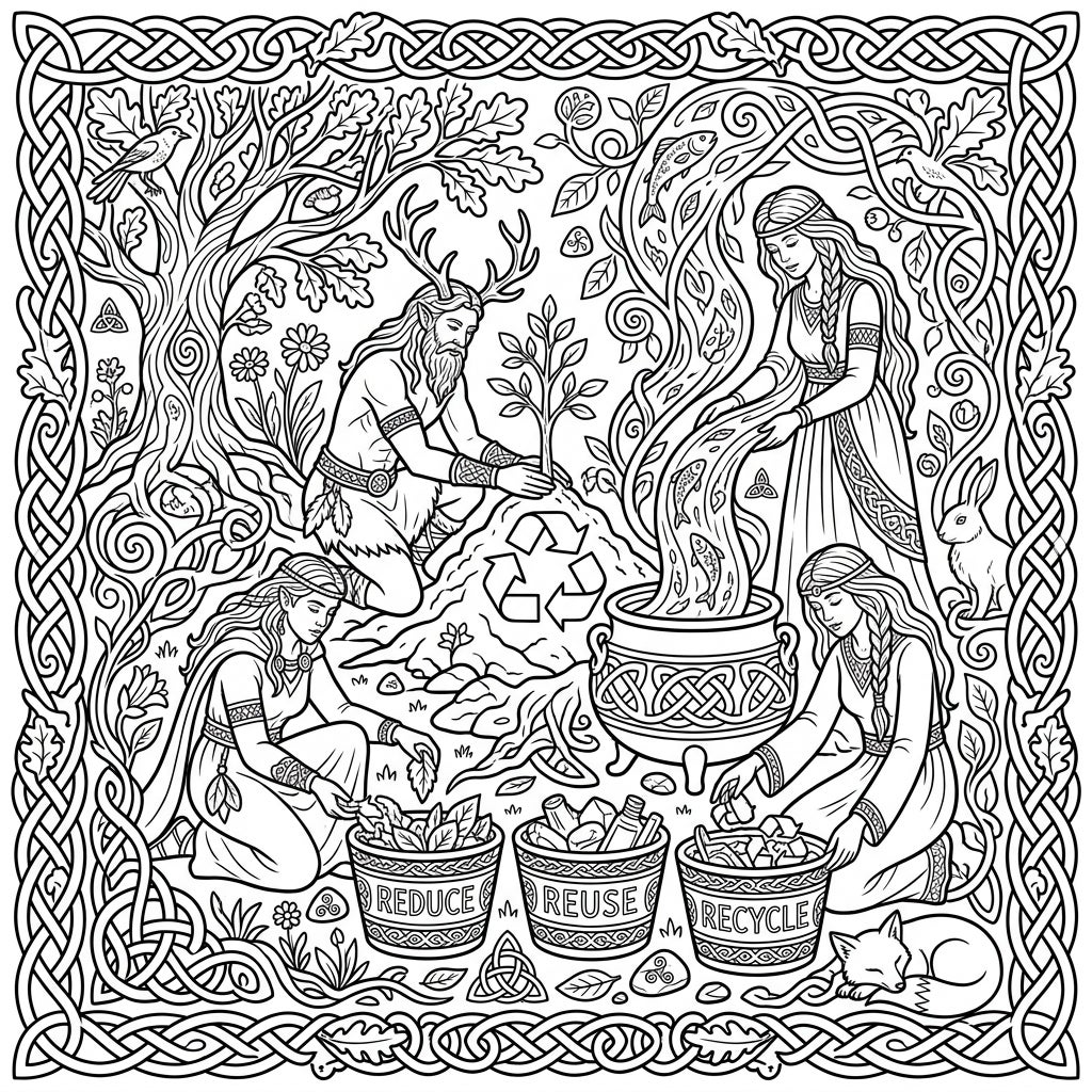 Step into a mythical realm where ancient Celtic gods and goddesses passionately safeguard our Earth. This intricate coloring page depicts a majestic antlered god planting a sapling next to a prominent recycling symbol, while three serene goddesses engage in various acts of environmental care. One pours life-giving water, teeming with fish, into a cauldron, symbolizing renewal, while two others thoughtfully sort items into bins marked 'Reduce,' 'Reuse,' and 'Recycle.' The entire scene is beautifully framed by elaborate Celtic knotwork, adorned with trees, vines, birds, and small animals, inviting you into a world where nature and spirituality intertwine.