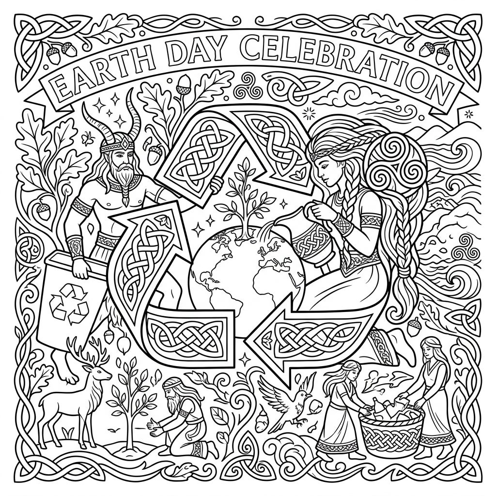 Immerse yourself in a unique Earth Day celebration featuring powerful Celtic Gods embracing environmental themes. This detailed coloring page offers an inspiring way to connect with ancient lore and modern ecological awareness.