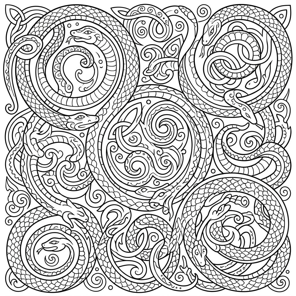 Delve into a captivating world of mythical creatures and ancient art with this mesmerizing Celtic Serpent Knots coloring page. The intricate design showcases multiple serpents and snakes, gracefully coiling and intertwining within a dense tapestry of traditional Celtic knotwork. Each serpent is meticulously detailed with scales and expressive forms, creating a rich visual experience that promises hours of focused coloring. The composition fills the entire frame with elaborate patterns, ensuring there are no empty spaces and providing a satisfying challenge for teen colorists.
