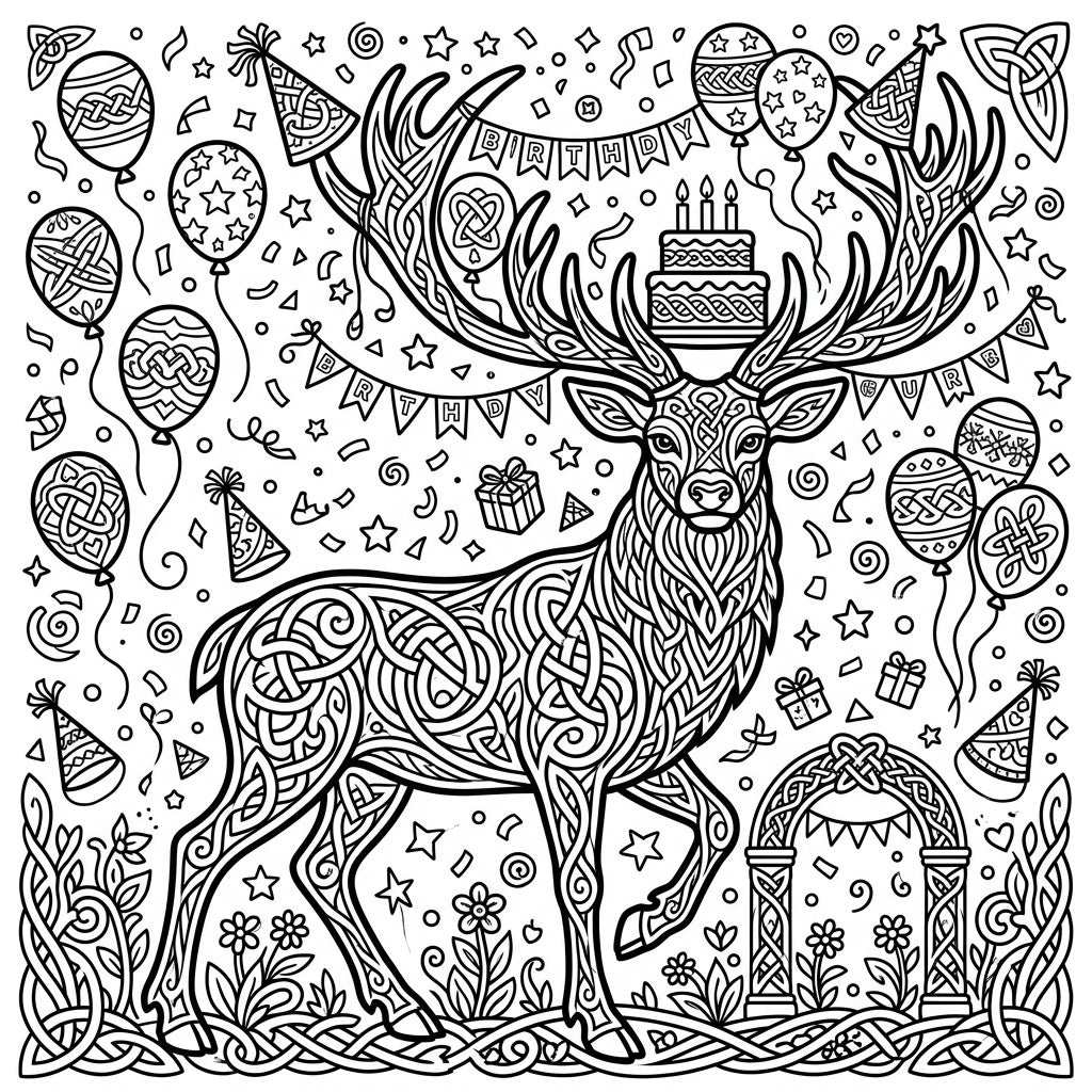 Embark on a creative journey with this stunning Celtic Stag Birthday coloring page. At its heart stands a majestic stag, its entire form intricately rendered with flowing Celtic knot patterns, symbolizing strength and timeless connection. Perched regally on its mighty antlers is a delightful birthday cake adorned with candles, while the surrounding scene bursts with festive elements like elegantly patterned balloons, scattered confetti, celebratory party hats, and a cheerful 'BIRTHDAY' banner woven throughout the design. The ground below features lush foliage and an ornate Celtic archway, all detailed with rich line art ready for your artistic touch.